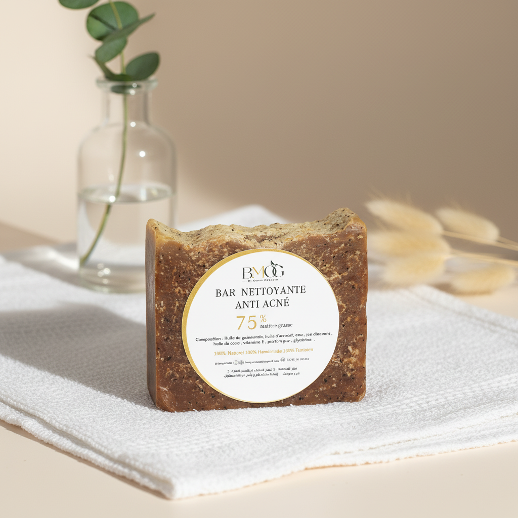 Savon doux anti-acné, formulé à base d’huiles végétales et d’aloe vera pour purifier la peau, réduire les imperfections et préserver l’hydratation.