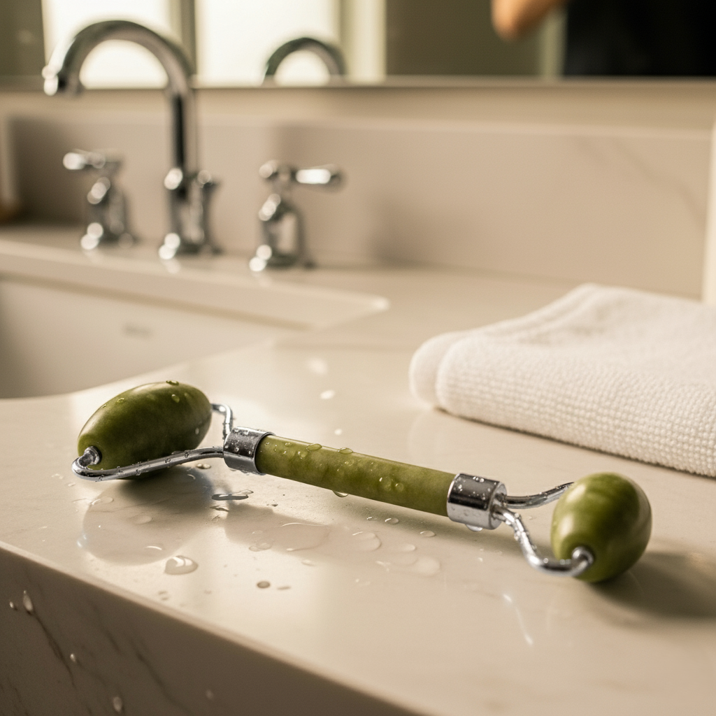 Le rouleau de jade, ou “Jade Roller”, est un accessoire de beauté ancestral originaire de Chine, conçu pour le massage du visage. Il est composé d’une poignée et de deux rouleaux en pierre de jade (un grand et un petit) montés sur une structure métallique.